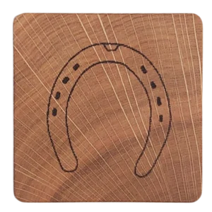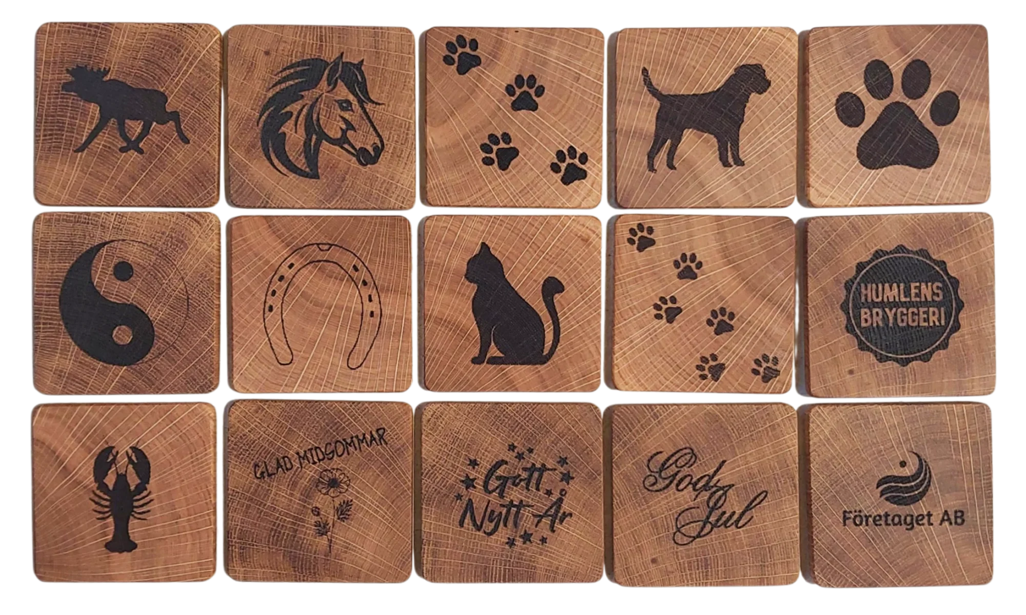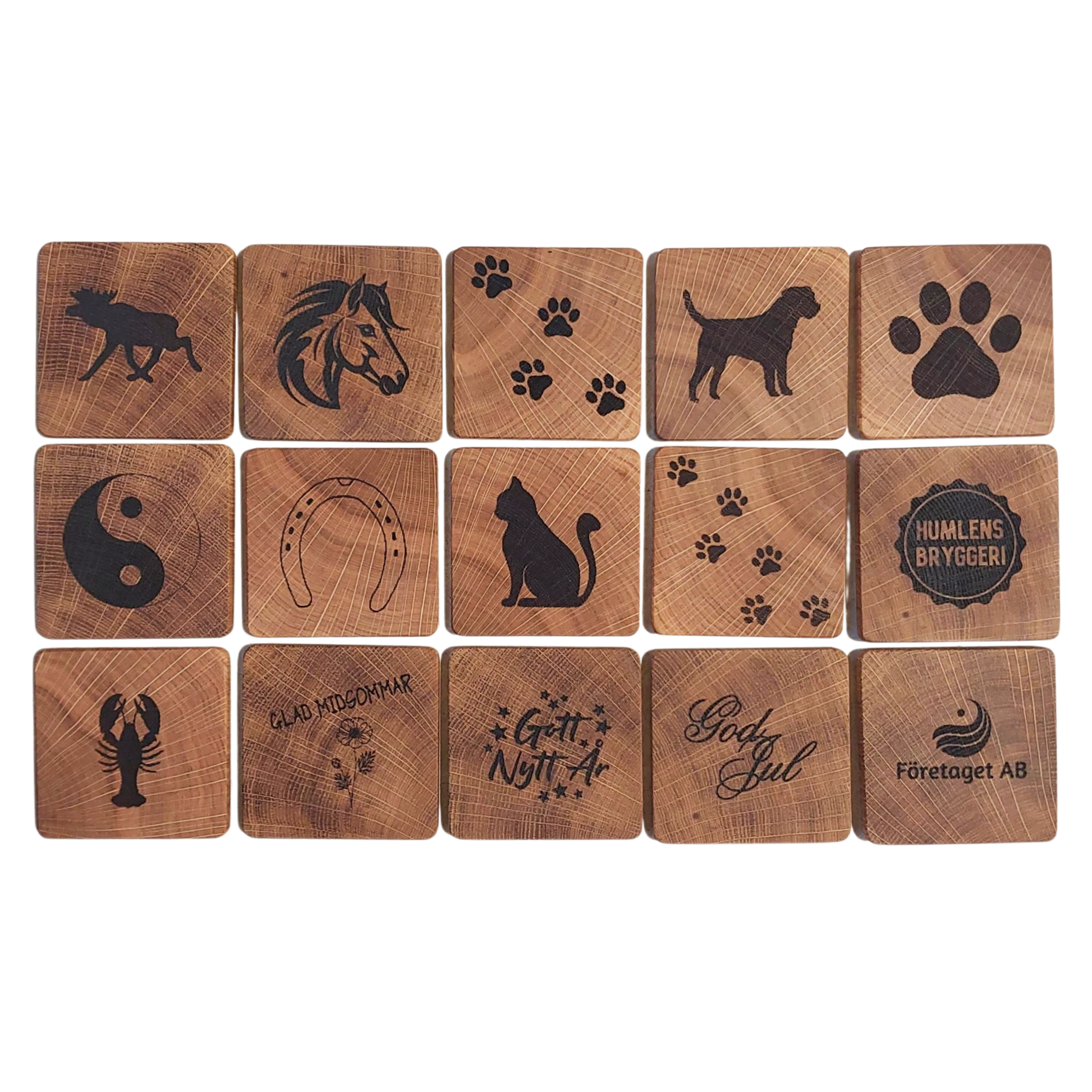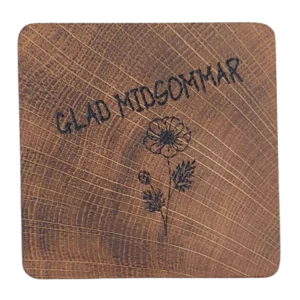 Glasunderläggen är tillverkade av robust och vacker skånsk ek. Varje motiv är omsorgsfullt brännmärkt för att skapa en unik och personlig design. Det finns ett antal förvalda motiven men det går även bra att föreslå andra motiv t.ex. företagsloggor.