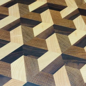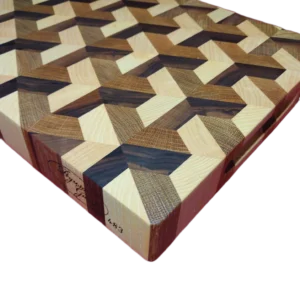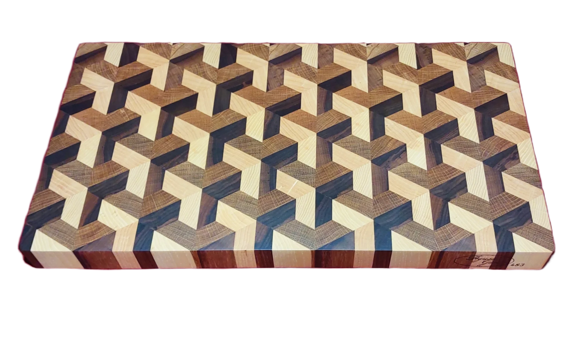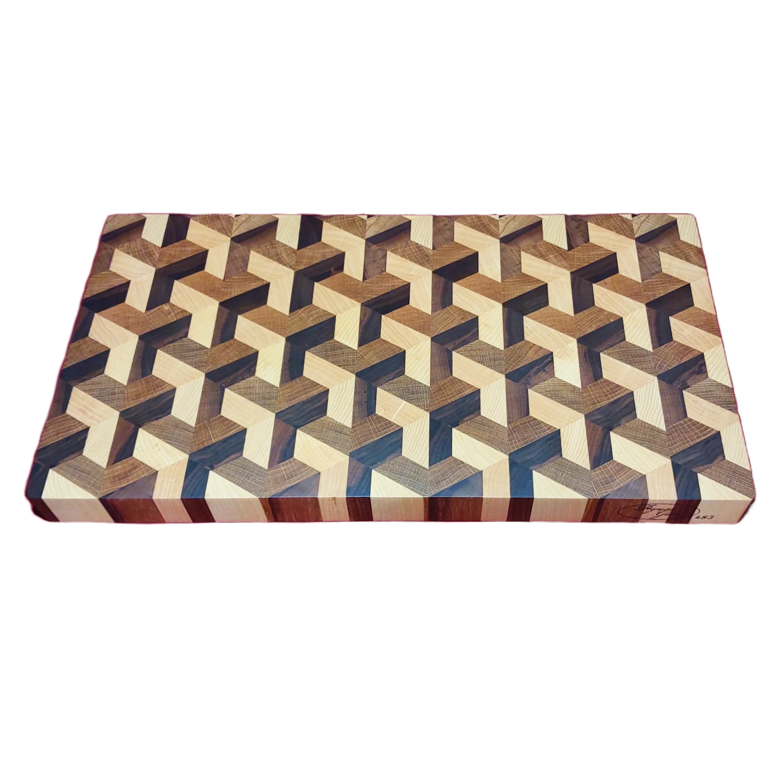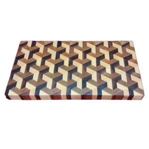 Upplev en skärbräda som är lika mycket konstverk som köksredskap! Vår handtillverkade ändträskärbräda med tredimensionellt mönster är skapad för dig som vill ha det allra bästa – både i funktion och design.