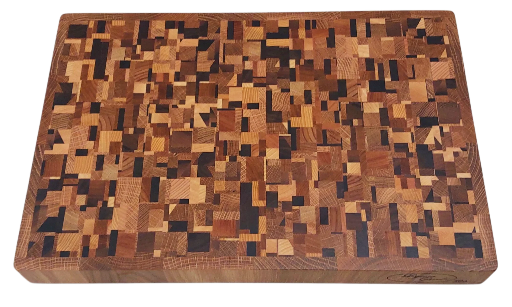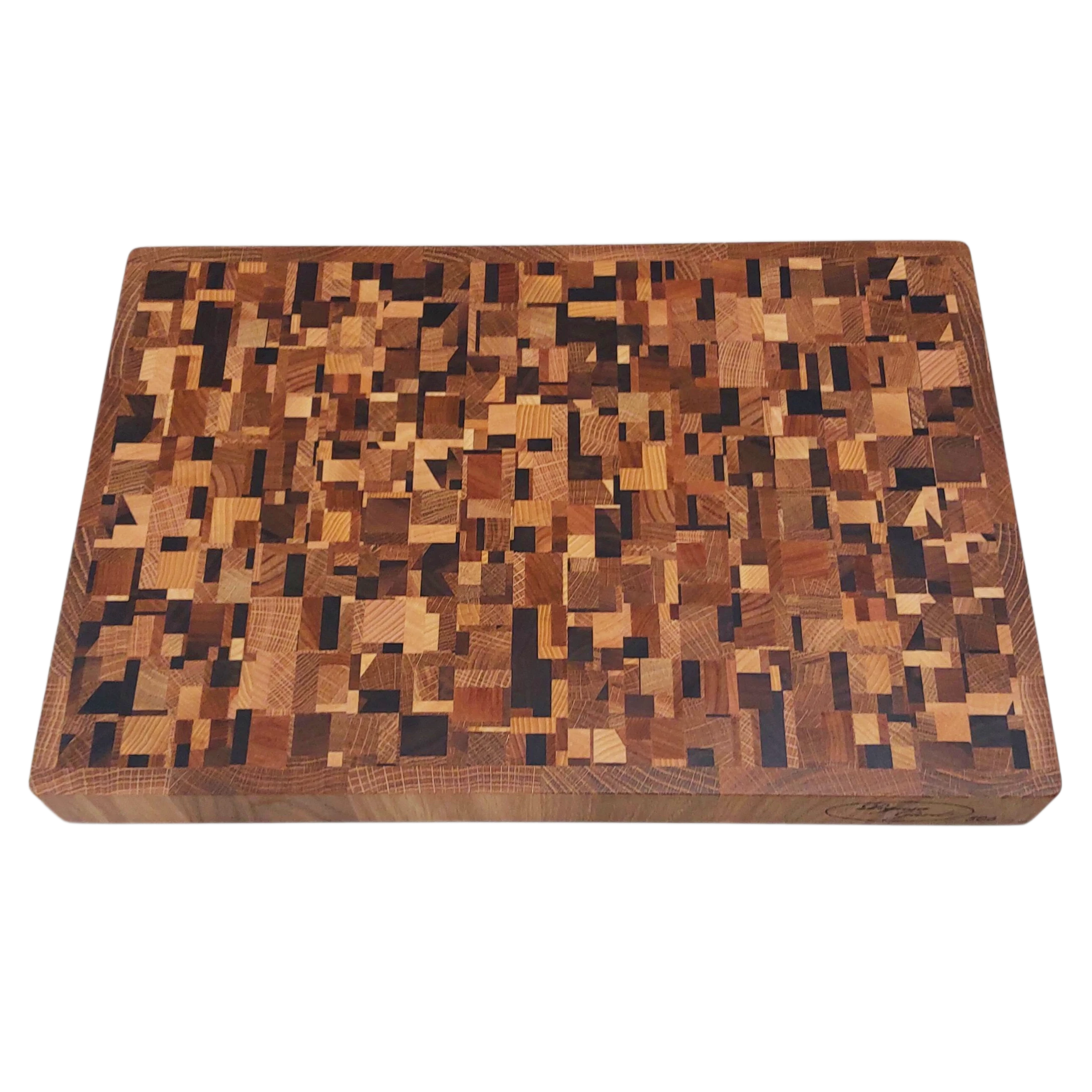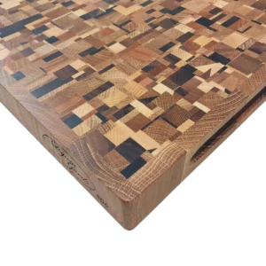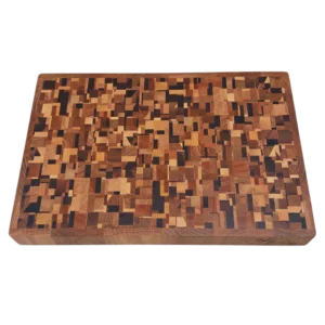 En handtillverkad kaosskärbräda som omedelbart fångar blicken och höjer känslan i hela köket. Denna ändträskärbräda är tillverkad av fem exklusiva träslag som tillsammans skapar ett livfullt mönster där varje bräda blir helt unik. Denna typ av skärbräda brukar kallas kaosskärbräda. Resultatet är en kraftfull kombination av ljusa, mörka och varmt gyllene toner som gör brädan lika mycket till inredningsdetalj som arbetsredskap.
