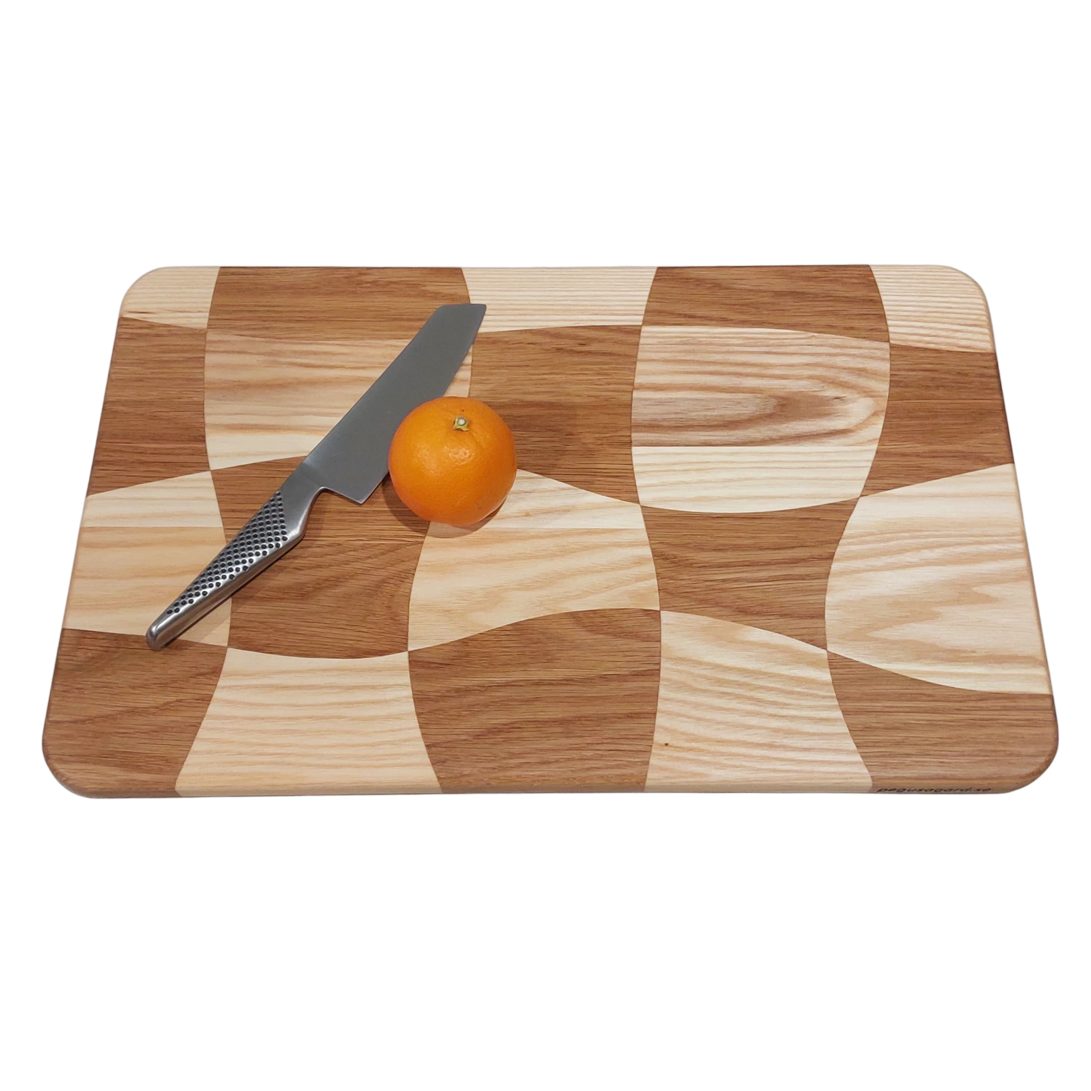 En snurrig skärbräda med oregelbundna rutor. På engelska kallas detta mönster ofta för ”drunken cuttingboard”. Det är ett unikt hantverk, skapat med omsorg av noggrant utvald ask och ek. De levande träslagen samspelar i ett lekfullt men sofistikerat mönster där ingen skärbräda är den andra lik.