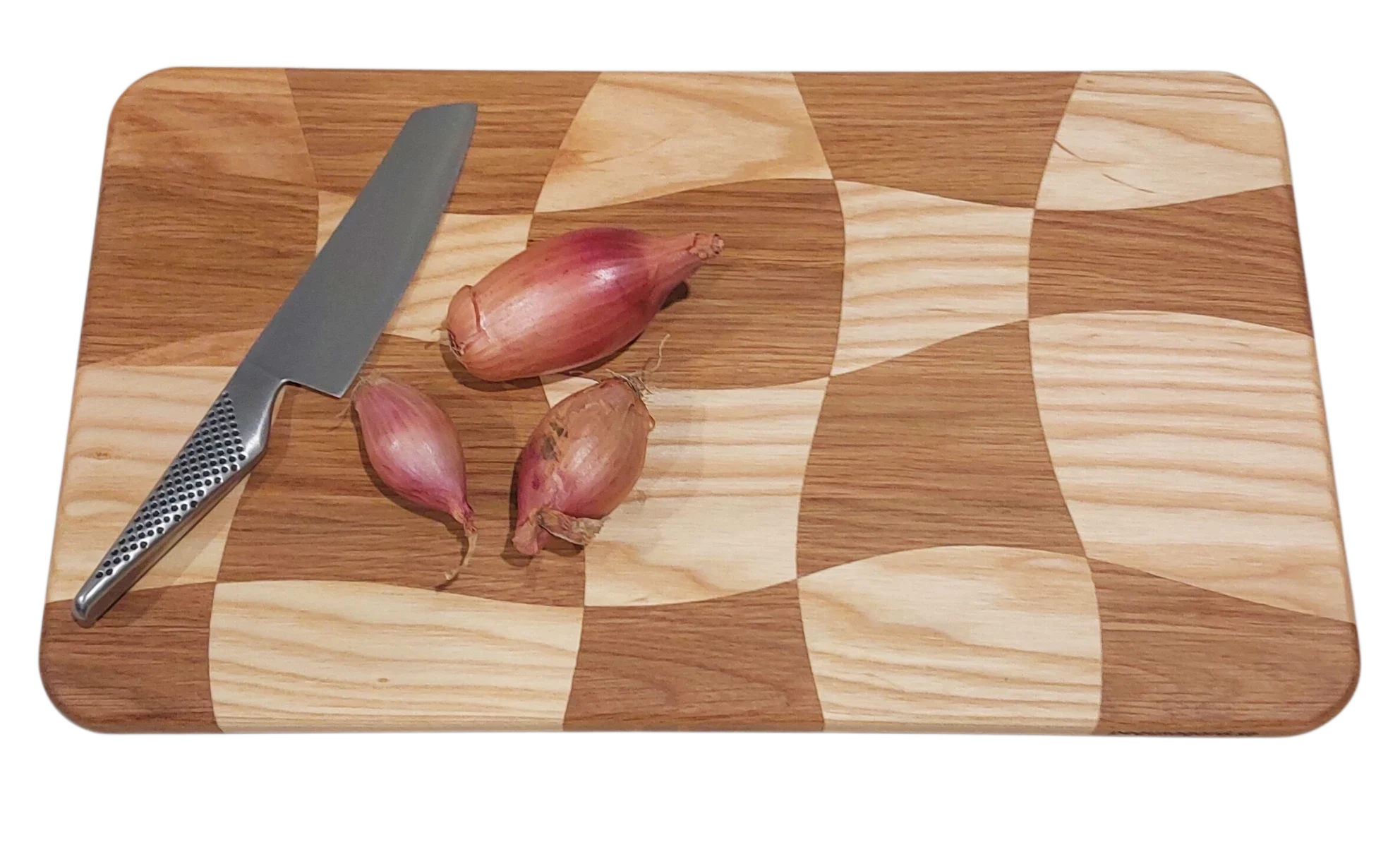 En snurrig skärbräda med oregelbundna rutor. På engelska kallas detta mönster ofta för ”drunken cuttingboard”. Det är ett unikt hantverk, skapat med omsorg av noggrant utvald ask och ek. De levande träslagen samspelar i ett lekfullt men sofistikerat mönster där ingen skärbräda är den andra lik.