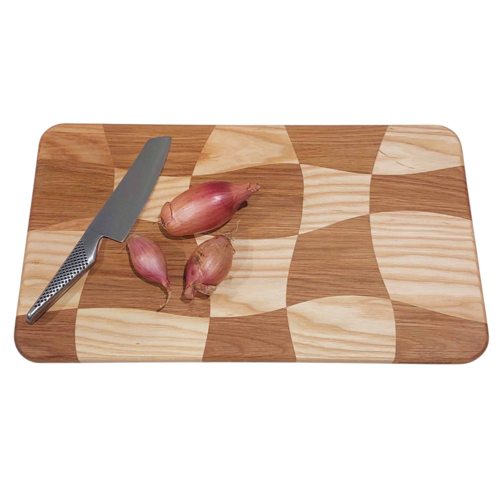 En snurrig skärbräda med oregelbundna rutor. På engelska kallas detta mönster ofta för ”drunken cuttingboard”. Det är ett unikt hantverk, skapat med omsorg av noggrant utvald ask och ek. De levande träslagen samspelar i ett lekfullt men sofistikerat mönster där ingen skärbräda är den andra lik.