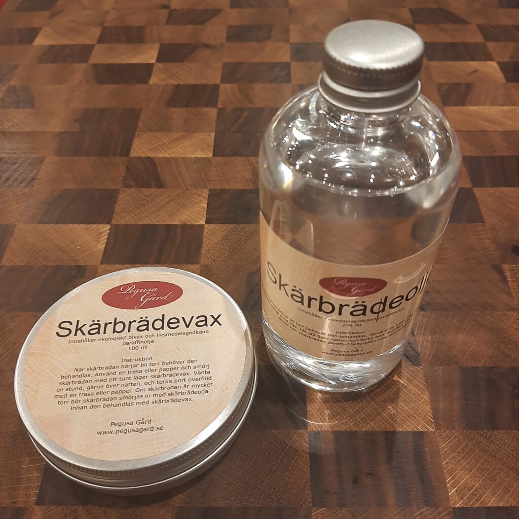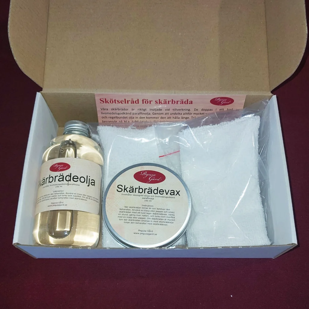 - Vi säljer även ett underhållskit som innehåller skärbrädeolja, skärbrädevax och trasor.